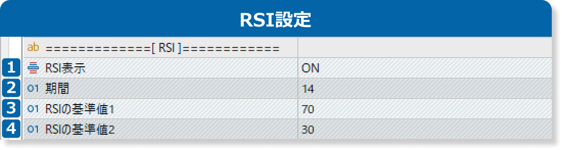RSIを表示するかを「ON」「OFF」から選択します。「適用価格帯」には「Close」が使用されます。